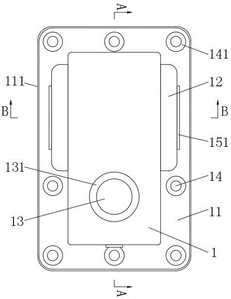 圖中標記:1-箱體;11-底板;111-密封護邊;112-密封槽;12-傳動軸外擴槽;13-第一軸孔;131-第一連接圈;14-安裝孔;141-加工臺;15-第二軸孔;151-第二連接圈。