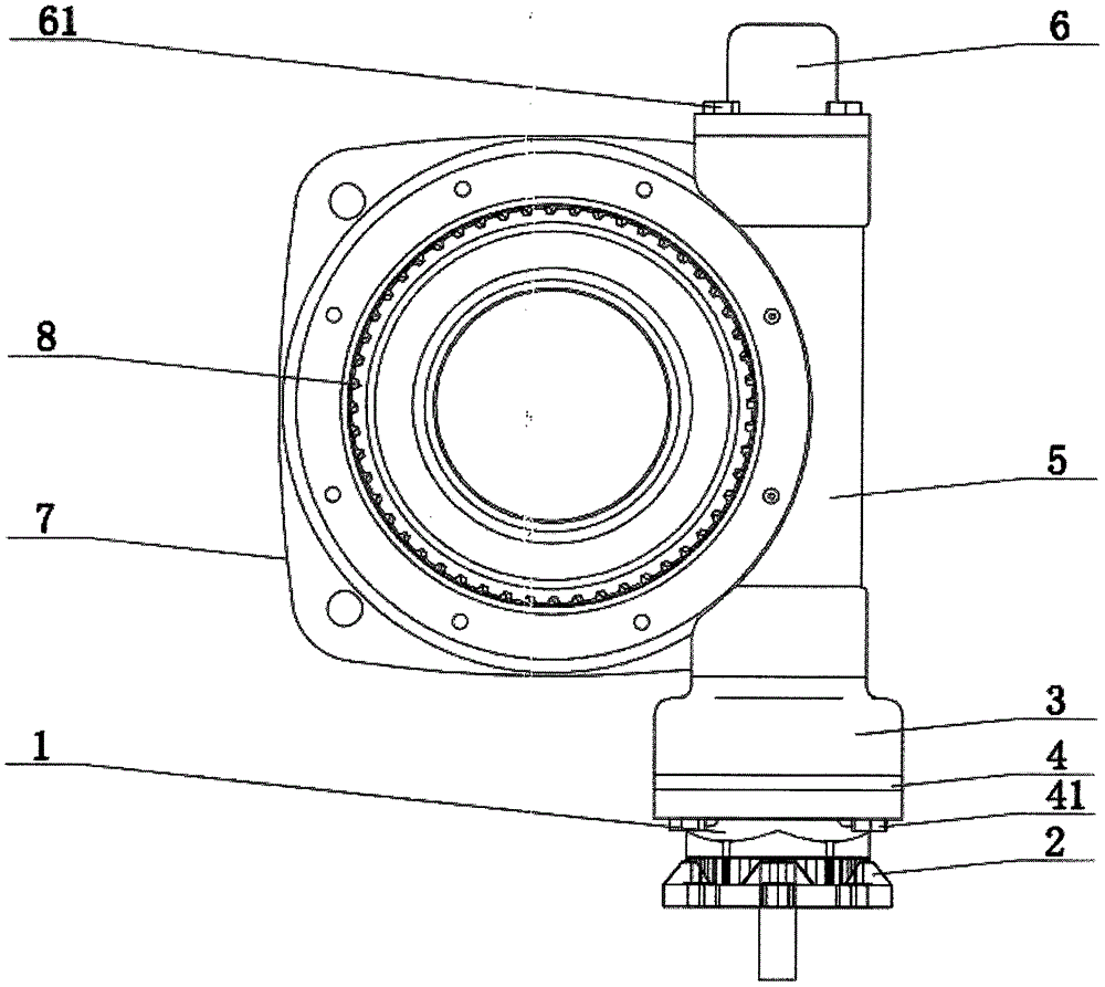 所述星型齒輪上箱體3與蝸桿箱體5連接處通過第二o形圈52連接。第二o形圈52的設(shè)置使得星型齒輪上箱體3與蝸桿箱體5連接處密封性強(qiáng),減少對內(nèi)部的污染減少液體進(jìn)入內(nèi)部。
